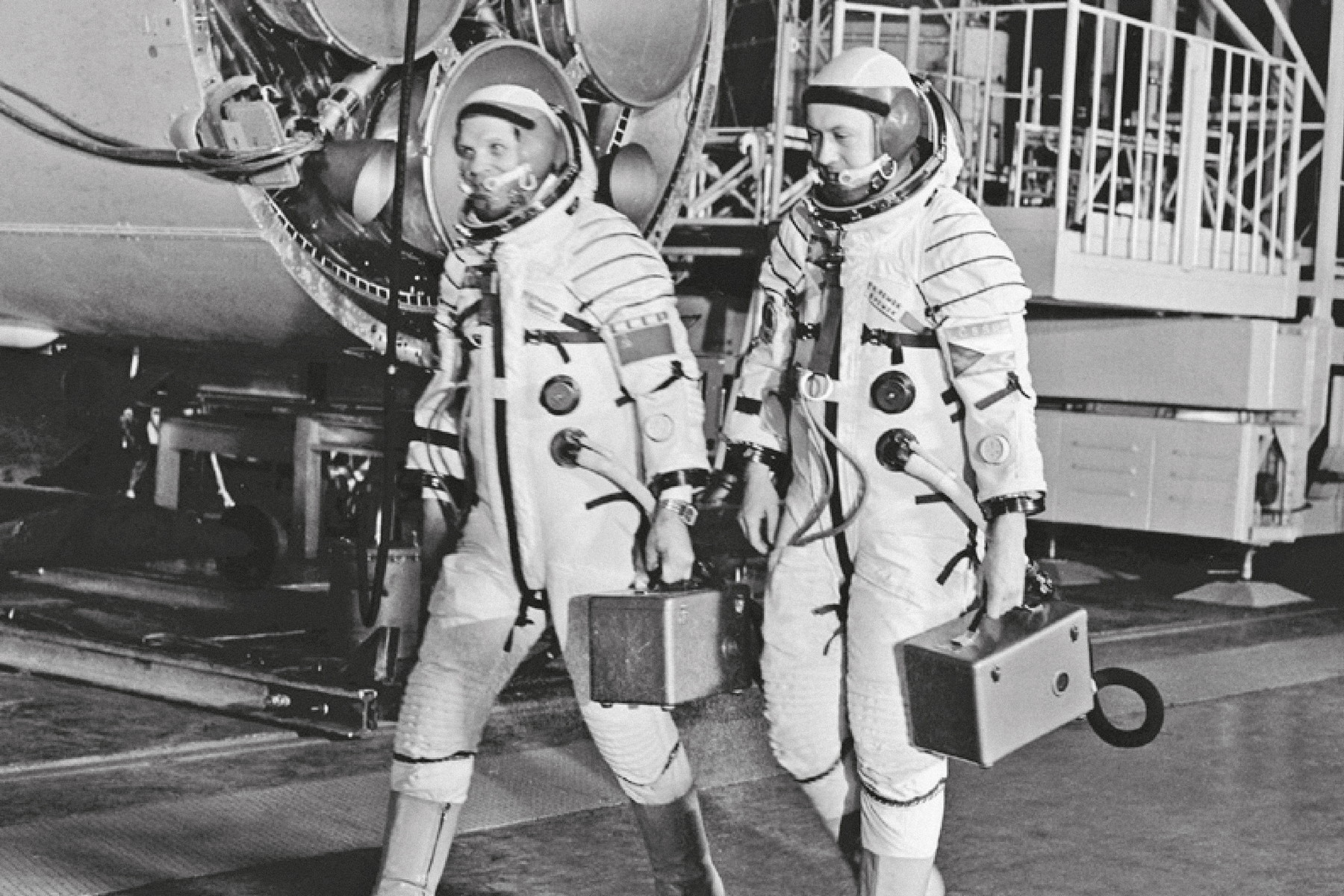 Alexej Gubarev a Vladimír Remek (vpravo) těsně před posledním nácvikem v kabině kosmické lodi, čtyři dny před startem. (foto: archiv Vladimíra Remka - se souhlasem k publikování)