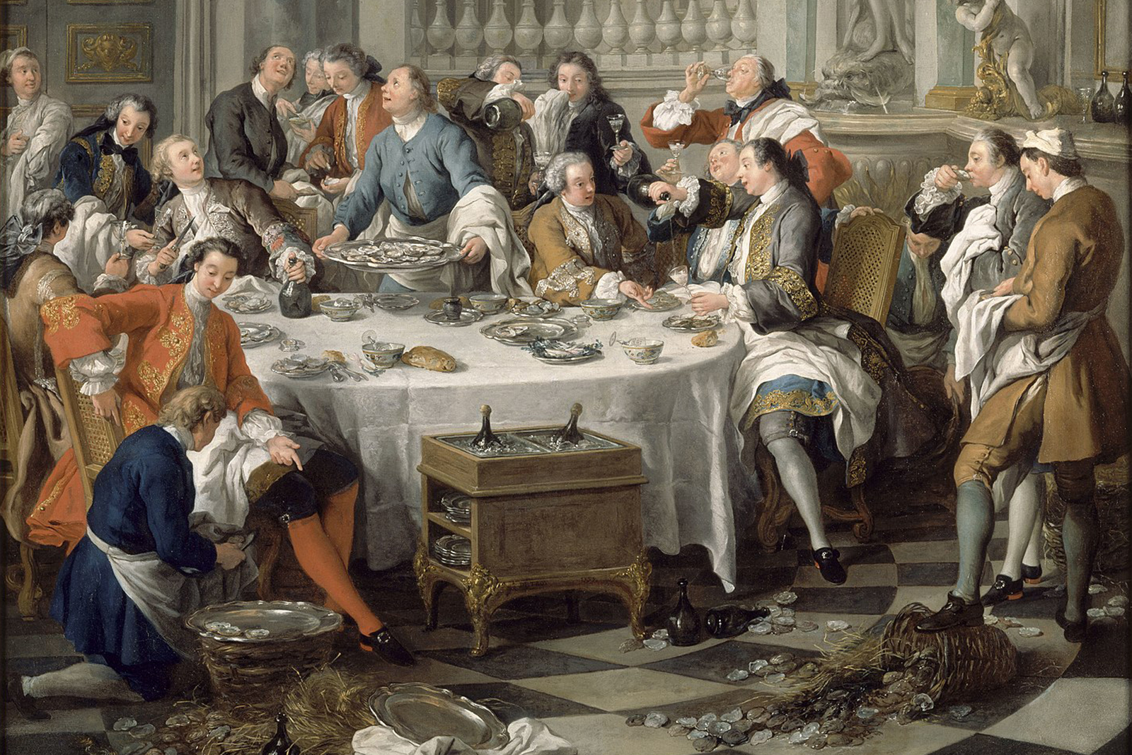 Stolování aristokracie v 18. století na plátně Jeana-Françoise de Troy z roku 1735. Obraz zachycuje jedno z prvních vyobrazení sektu. (ilustrace: Wikimedia Commons, Jean-François de Troy, CC0)