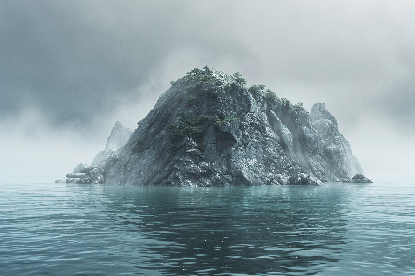 Z masivního objektu v mlze se často vyklube ledovec, plovoucí sopečná pemza, nebo prostě jen optický klam… (ilustrace: Midjourney AI, PDM 1.0)