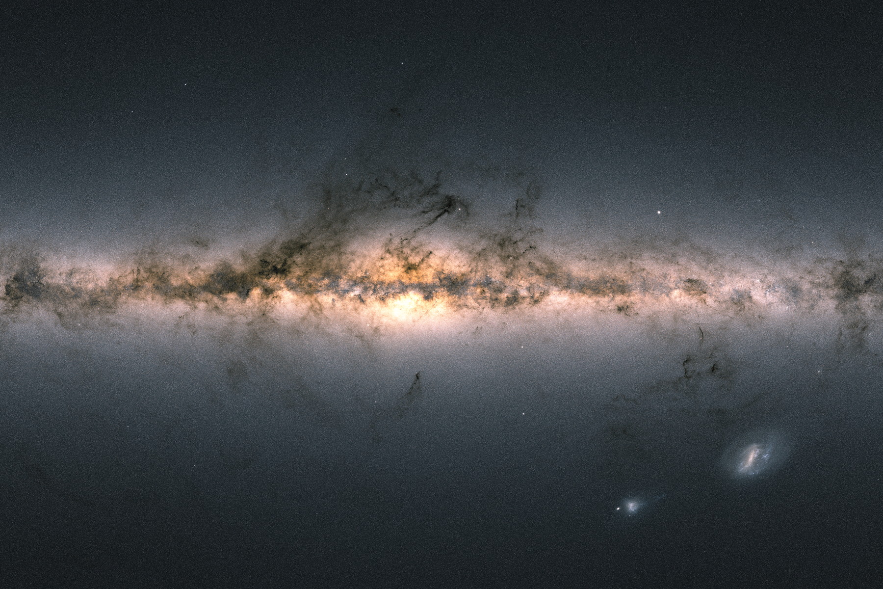 Jasná horizontální struktura, která snímku dominuje, je rovina naší galaxie Mléčné dráhy. Ve skutečnosti se jedná o zploštělý disk viděný z okraje, který obsahuje většinu hvězd galaxie. Uprostřed snímku se jeví jasný střed Galaxie, který je přeplněný hvězdami. (foto: ESA/Gaia/DPAC, CC BY-SA 3.0)