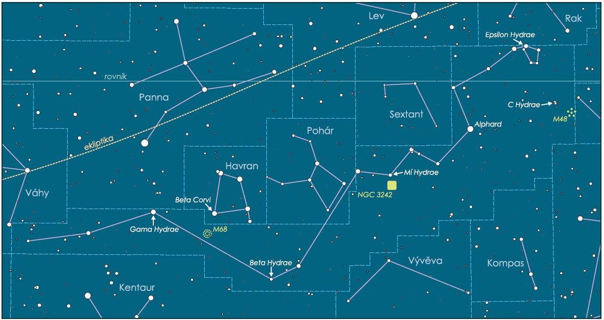 Planetární mlhovinu NGC 3242 objevil roku 1785 astronom William Herschel. Už tehdy mimochodem poznamenal, že „vydává světlo v barvě Jupitera“. Současné poetické označení pro ni však teprve v roce 1882 zavedl jiný Angličan, námořní kapitán William Noble, který ji popsal jako „bleděmodrý disk připomínající ducha Jupitera“. (foto: Wikimedia Commons, Judy Schmidt, CC BY 2.0)