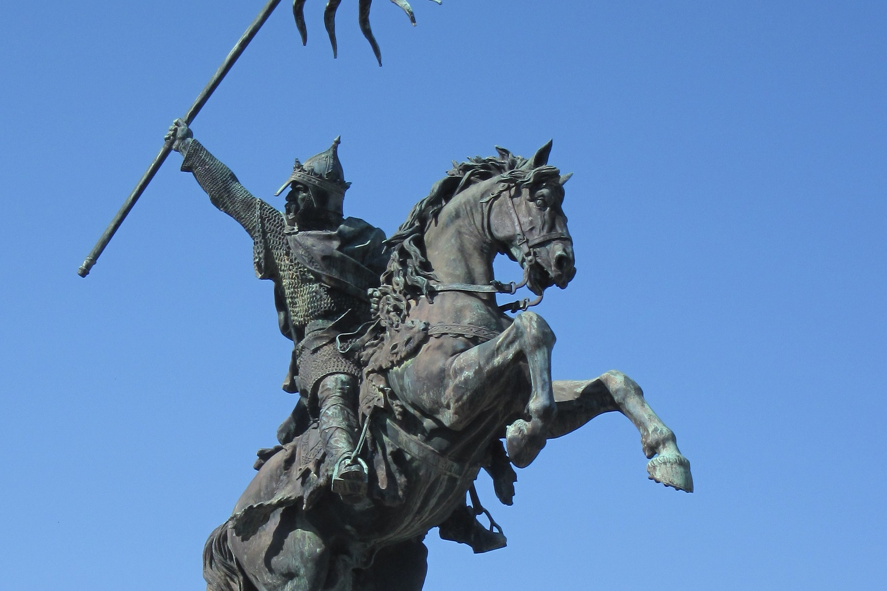 Vítězný Vilém Dobyvatel na jezdecké soše.