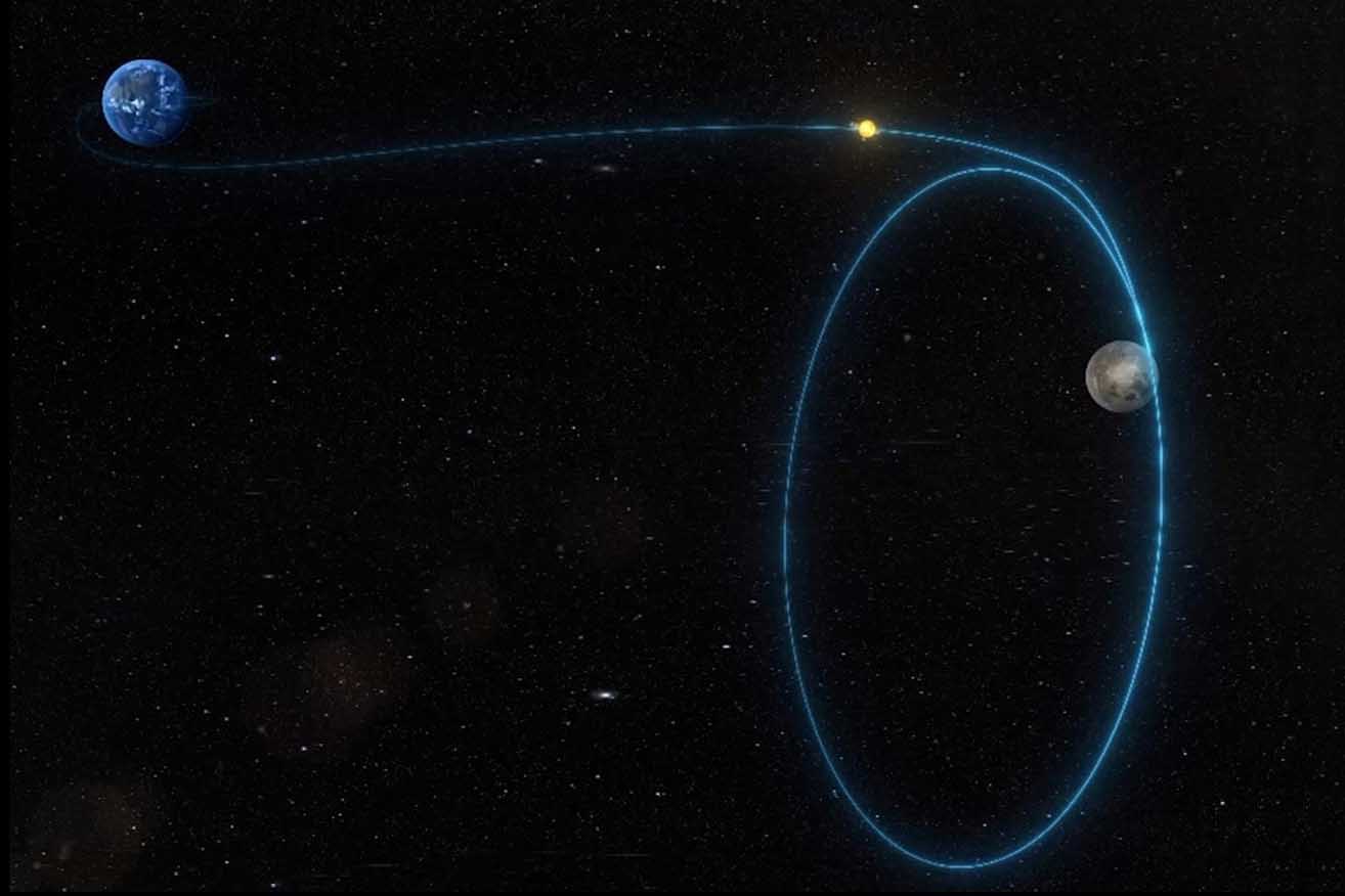Znázornění letu a oběžné dráhy lunárního satelitu Čchüe-čchiao 2 (Queqiao-2). (ilustrace: CGTN, CC BY-SA 4.0)