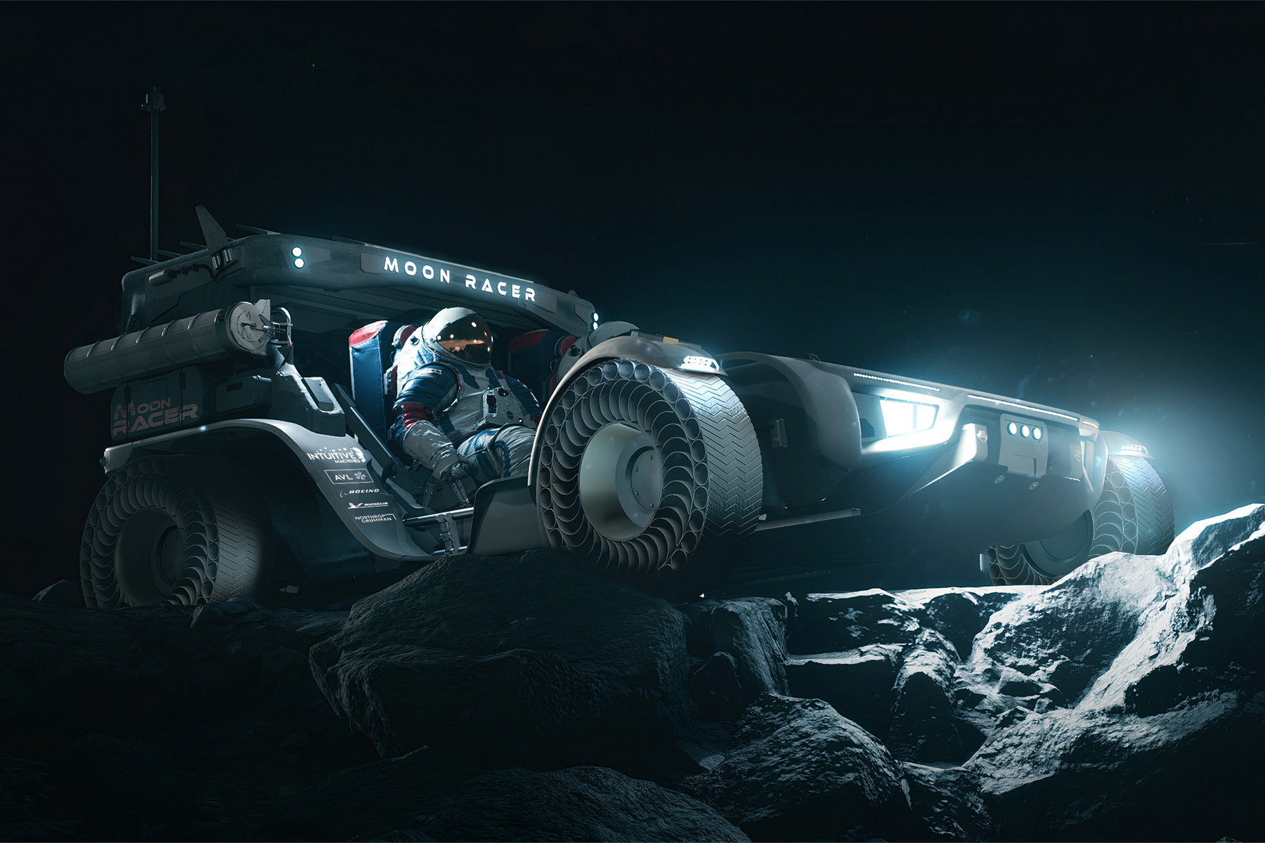 Umělecký koncept lunárního terénního vozidla Moon RACER společnosti Intuitive Machines. (zdroj: NASA/Intuitive Machines, CC BY 4.0)