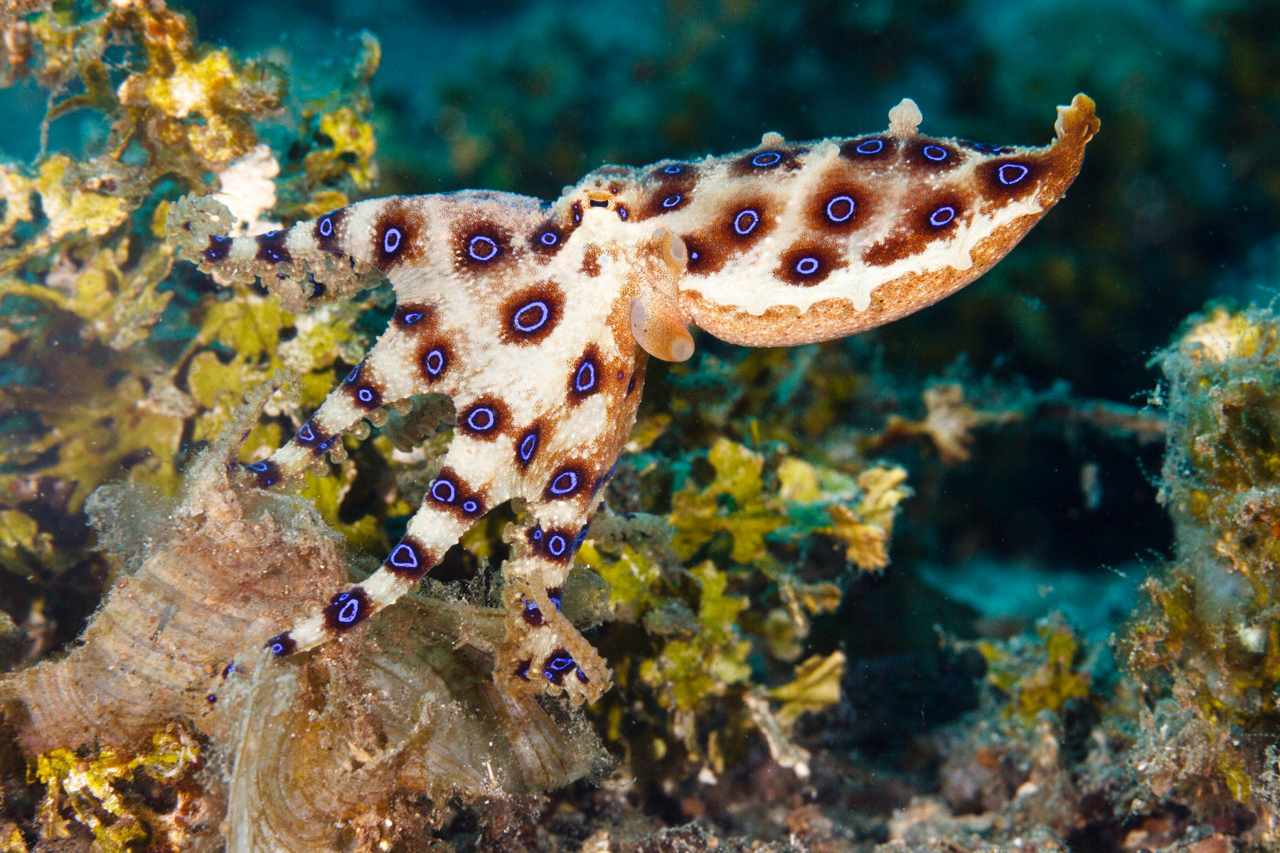 Chobotnice kroužkovaná (Hapalochlaena lunulata) obývá mělké vody severního pobřeží Austrálie a některé oblasti západního Tichomoří. Její kousnutí je sice bezbolestné, způsobuje ale postupné ochrnutí, včetně ochrnutí dýchacích svalů. (foto: Shutterstock)