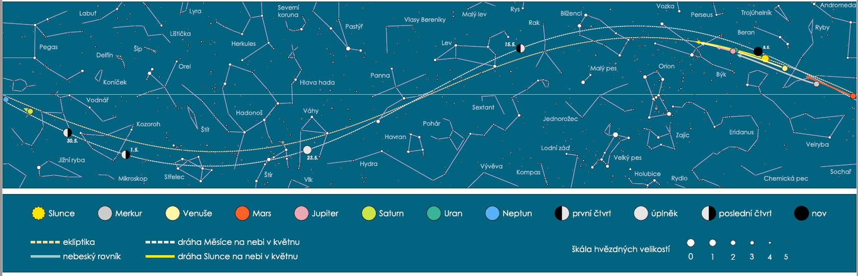 • Obdélníková mapa uvádí přibližné polohy významných těles Sluneční soustavy na květnové obloze. U Měsíce jsou zvýrazněny pozice (včetně přesného data), kdy nastává první čtvrt, úplněk, poslední čtvrt a nov. (zdroj: Jan Píšala - se souhlasem k publikování)
