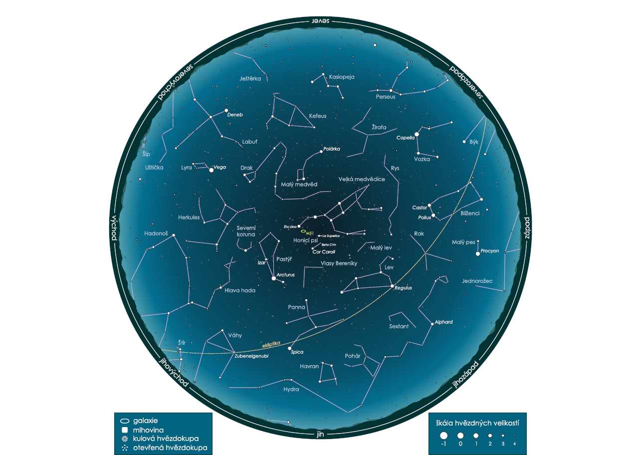 • ruhová mapa zobrazuje podobu nočního nebe 15. května 2024 ve 22:00 středoevropského letního času (SELČ). Na počátku měsíce platí pro 23:00 SELČ, na jeho konci pro 21:00 SELČ. (zdroj: Jan Píšala - se souhlasem k publikování)