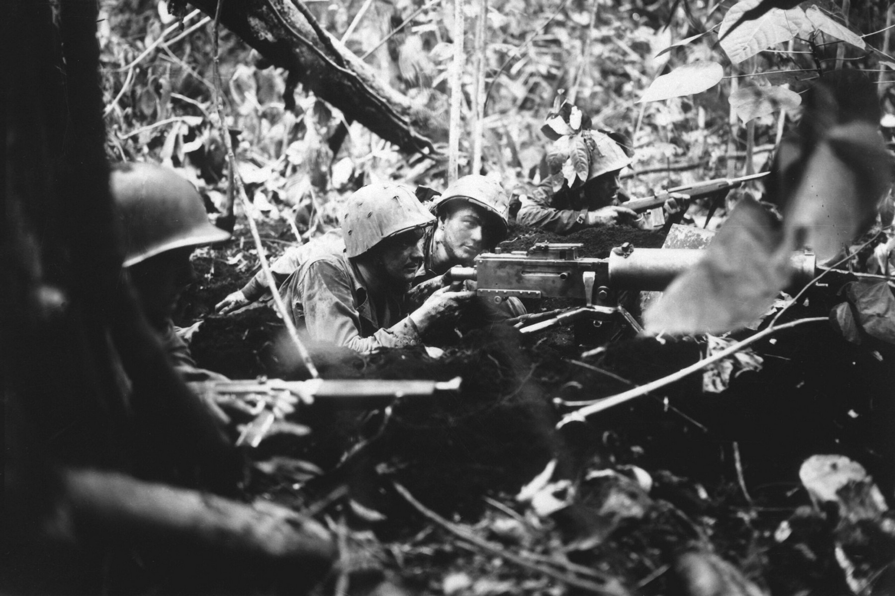 Příslušníci americké námořní pěchoty během bojů v Tichomoří s kulometem M1917. (foto: Wikimedia Commons, U.S. Navy, PDM 1.0)