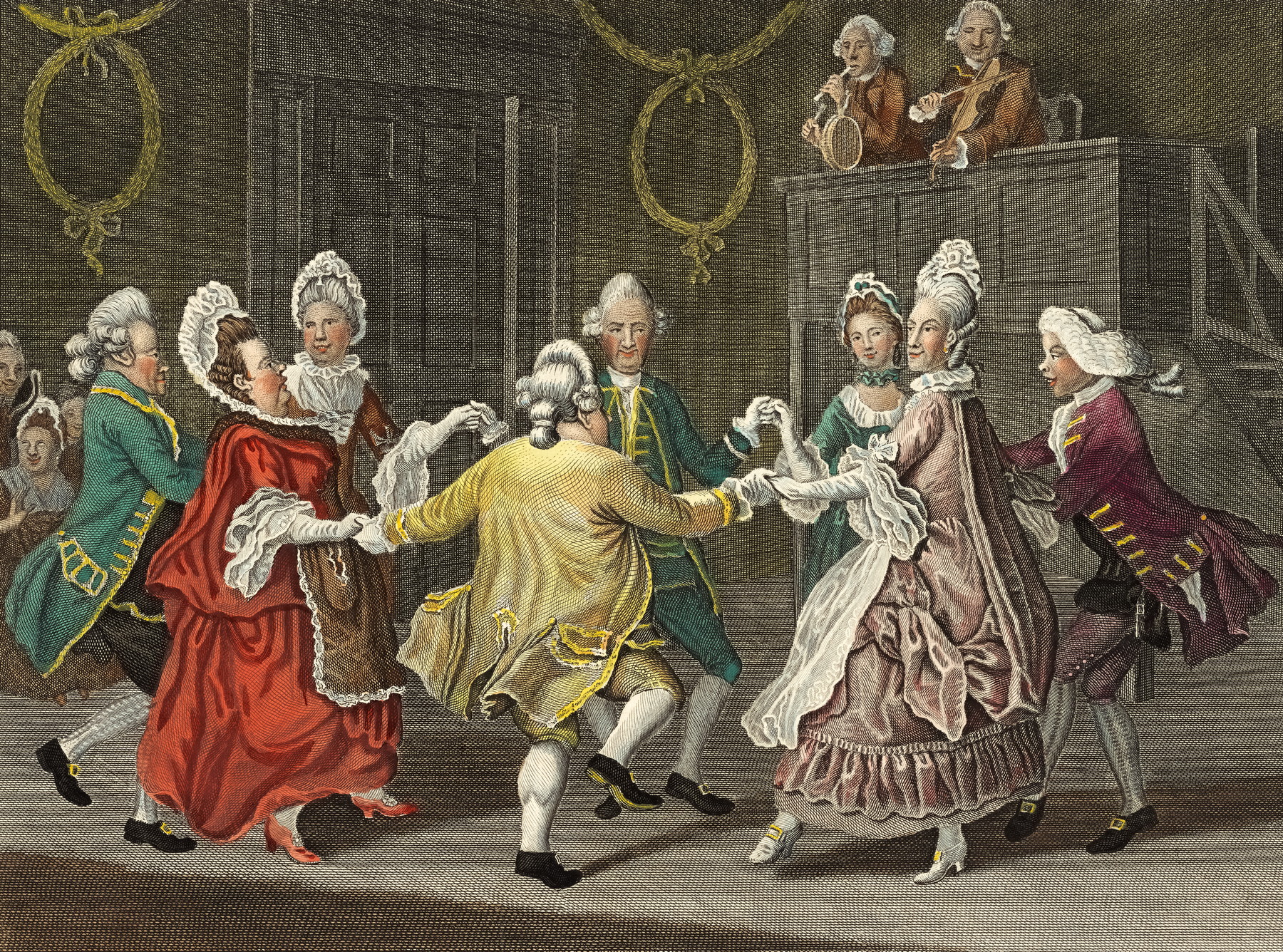 Populární cotillion přišel do Rakouska z Francie. Tančily ho čtyři páry v kruhovém uspořádání a na konci století se z něj vyvinula čtverylka. (ilustrace: Wikimedia Commons, James Caldwall, CC0 1.0)