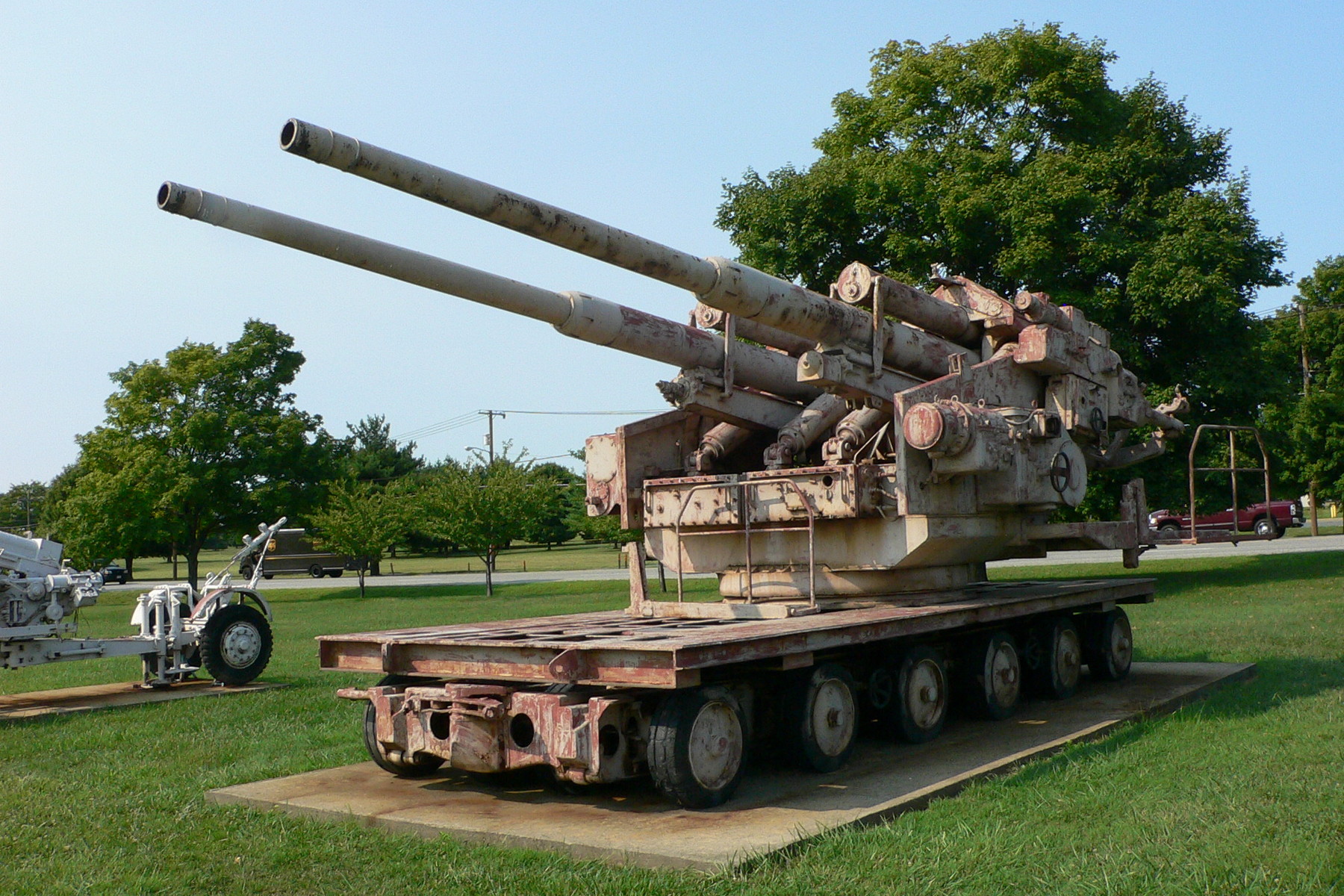 Obří zbraně 12,8-cm Flakzwilling 40/2 se umisťovaly na flakové věže, tento kanon je dnes k vidění v dělostřeleckém muzeu v americkém Aberdeenu. (foto: Wikimedia Commons, Mark Pellegrini, CC BY-SA 2.5)