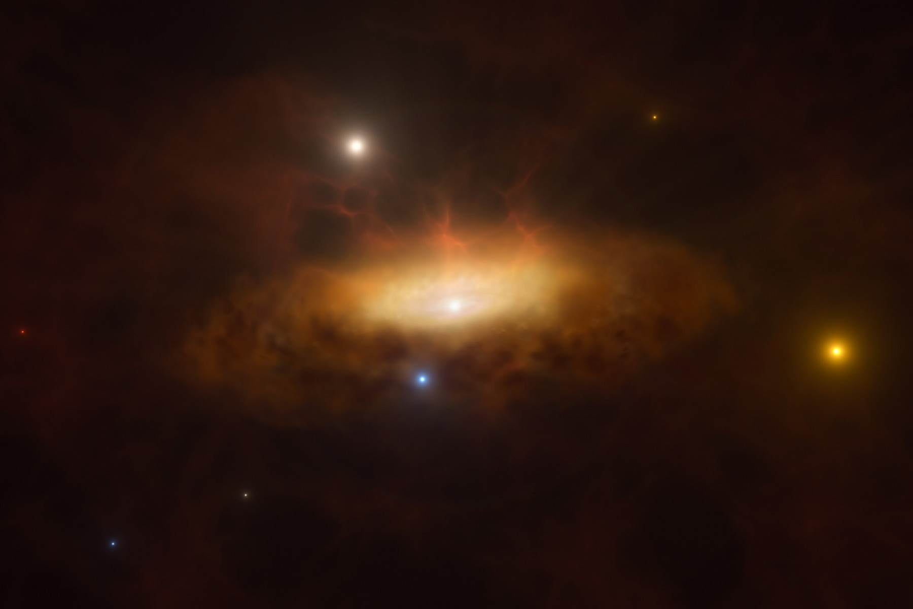 Náhle zjasnění galaxie SDSS1335+0728 zřejmě souvisí s probuzením její černé díry. Nic podobného jsme v reálném čase ještě neviděli. (ilustrace: ESO/M. Kornmesser, CC BY-SA 4.0)