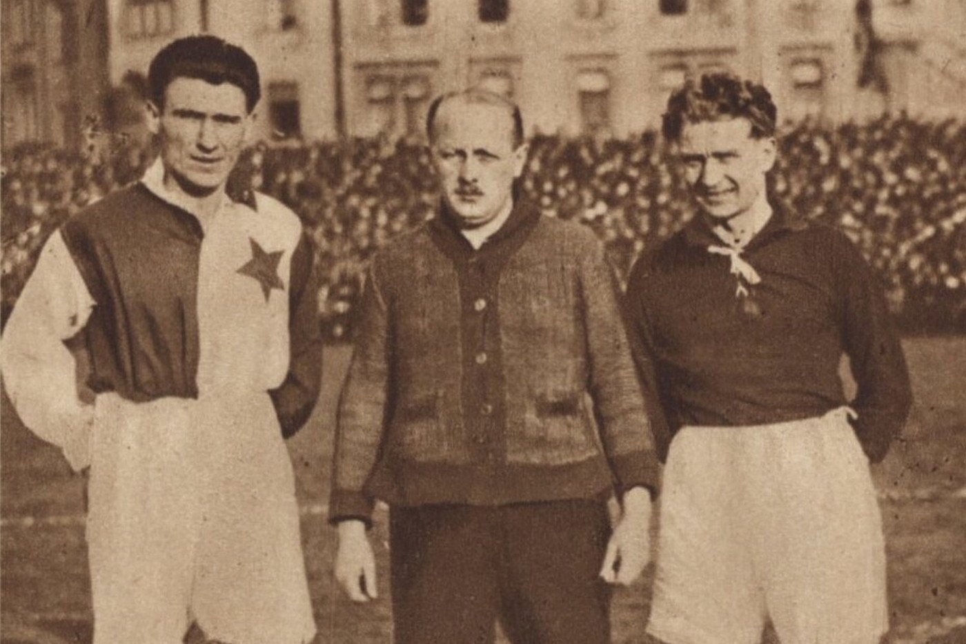 Kapitán SK Slavie Josef Pleticha a kapitán Sparty Karel Pešek před derby v roce 1927 – skončilo nerozhodně 2:2. (foto: Wikimedia Commons, PDM 1.0)