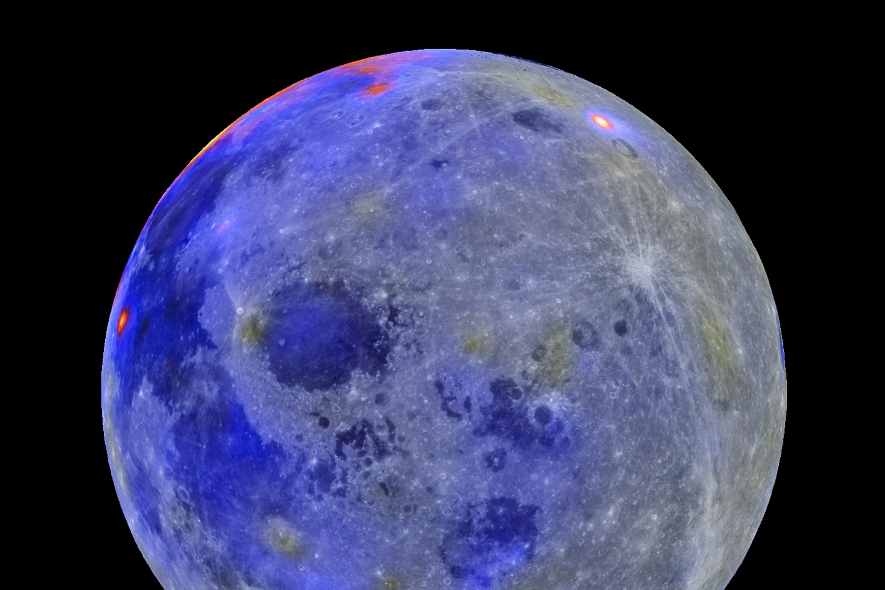 Zvláštní místo na odvrácené straně Měsíce prozrazuje i zvýšená koncentrace radioaktivního thoria (jasná skvrna v pravé horní části disku). (foto: NASA, CC BY 4.0)
