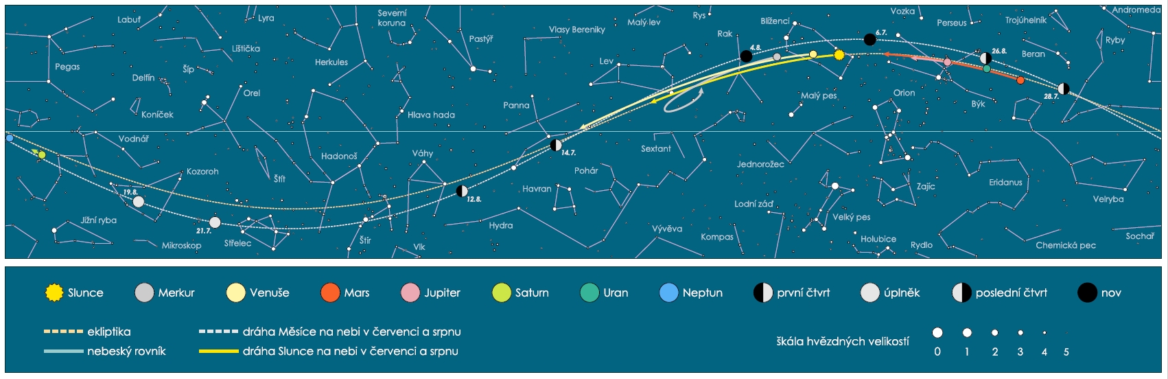 Obdélníková mapa uvádí přibližné polohy významných těles Sluneční soustavy na červencové a srpnové obloze. (zdroj: Jan Píšala - se souhlasem k publikování)