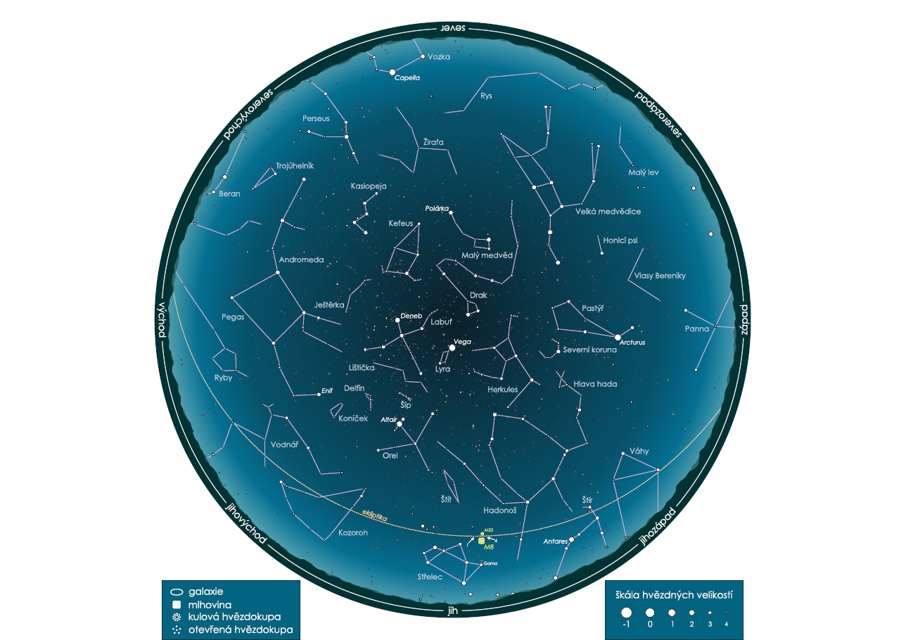 Kruhová mapa zobrazuje podobu nočního nebe na přelomu července a srpna 2024 ve 23:00 středoevropského letního času (SELČ). (zdroj: Jan Píšala - se souhlasem k publikování)