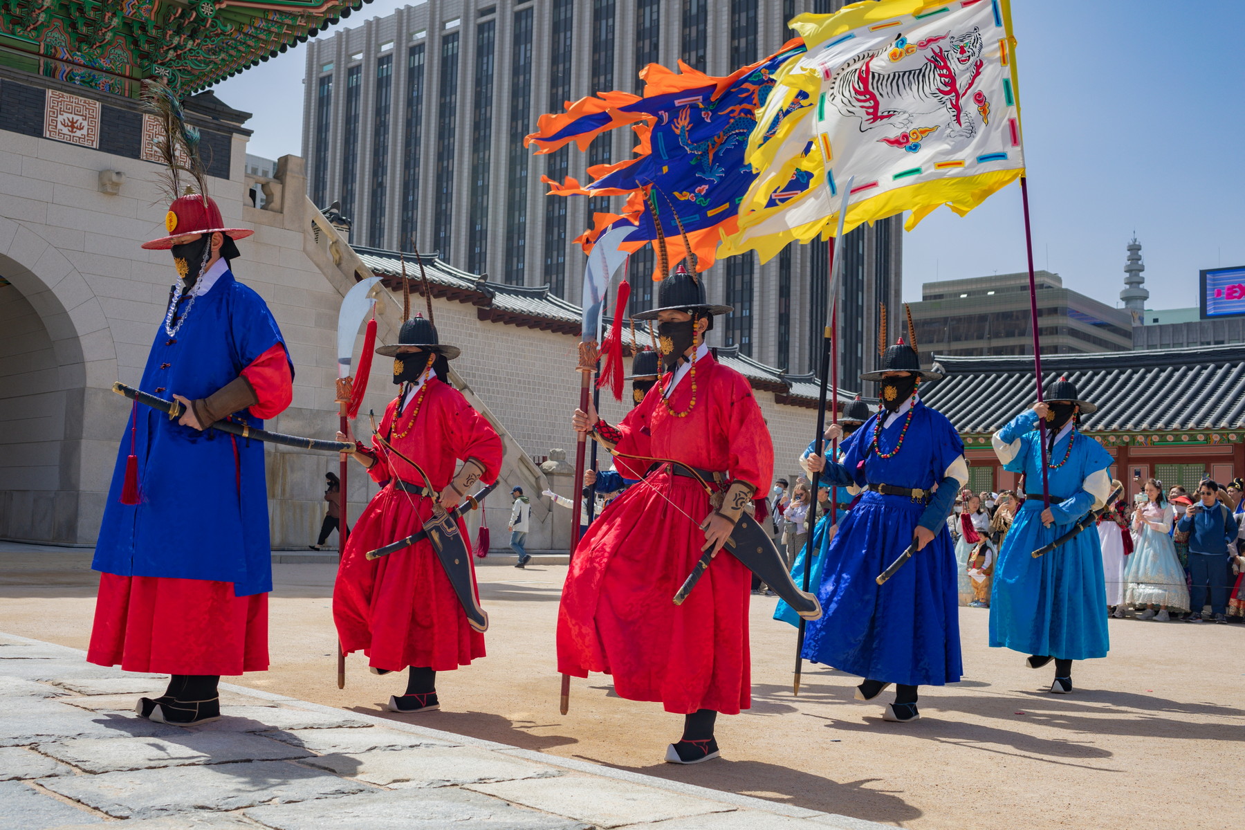• Pestrobarevně oděné stráže s meči a praporci se v paláci Kjongbokkung střídají za zvuku bubnů. (foto: Shutterstock)