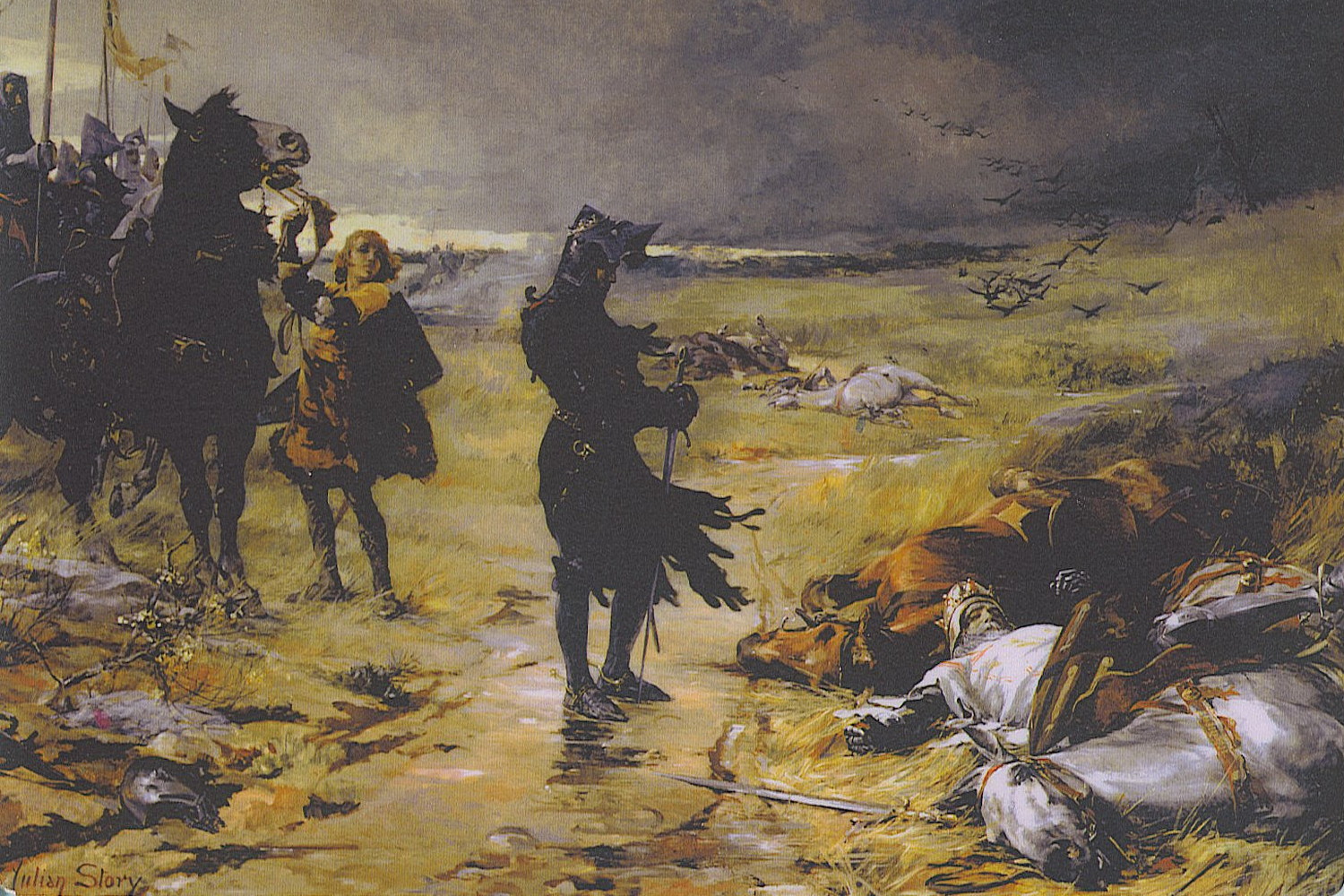 Podle legendárního podání vznikla přezdívka tak, že v bitvě u Kresčaku na sobě mladý princ měl bohatě zdobený černý kyrys. (ilustrace: Wikimedia Commons, Julian Russell Story, PDM 1.0)