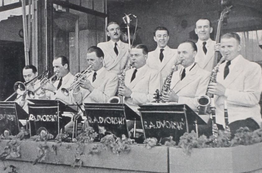 R. A. Dvorský (stojící zcela vlevo) s orchestrem.