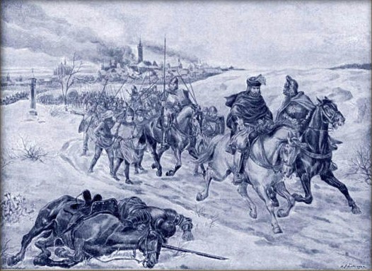 Zapálení Kutné Hory a útěk křižáků před navrátivším se Janem Žižkou. (ilustrace: Wikimedia Commons, Hugo Schüllinger, PDM 1.0)