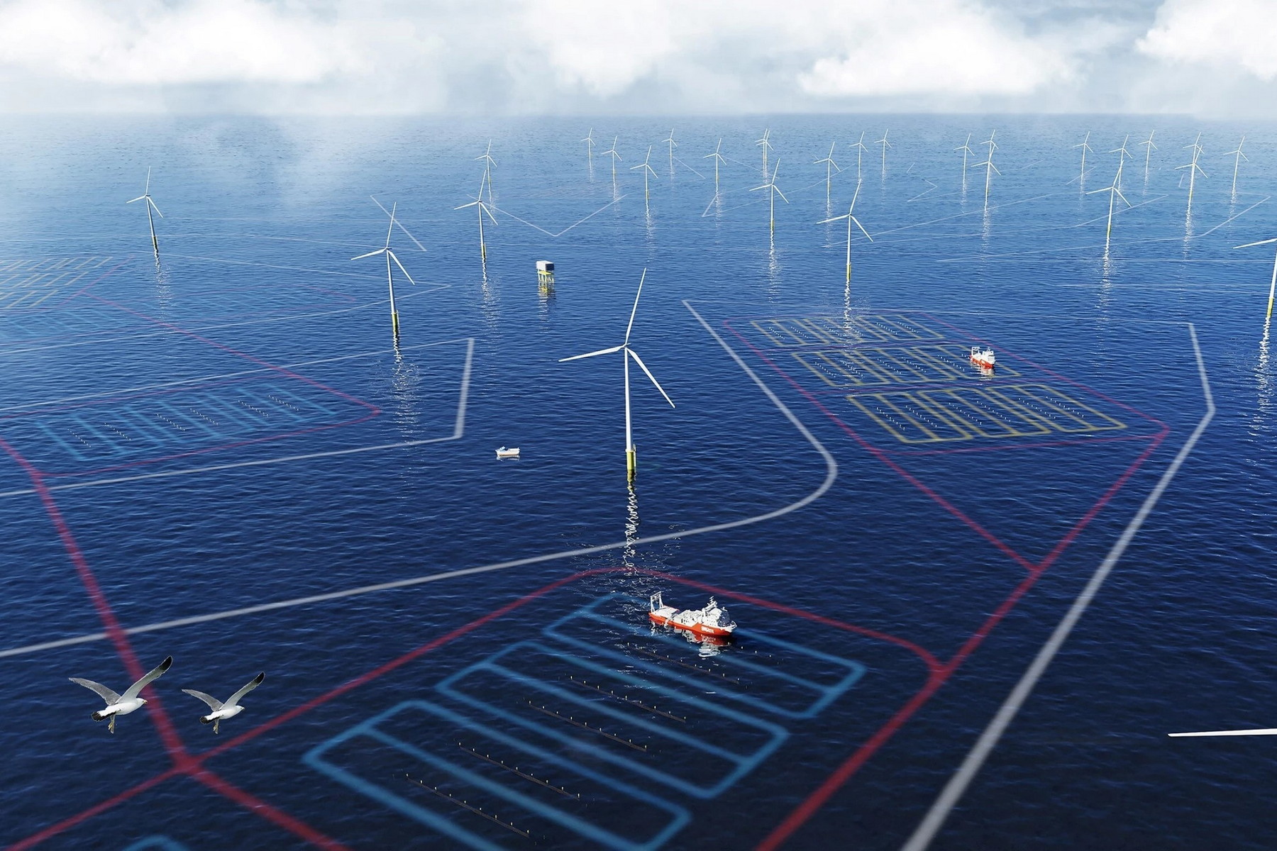 Budoucí podoba řasové farmy v prostoru větrné farmy Hollandse Kust Zuid. (zdroj: The Hague & Partners, CC BY-SA 4.0)