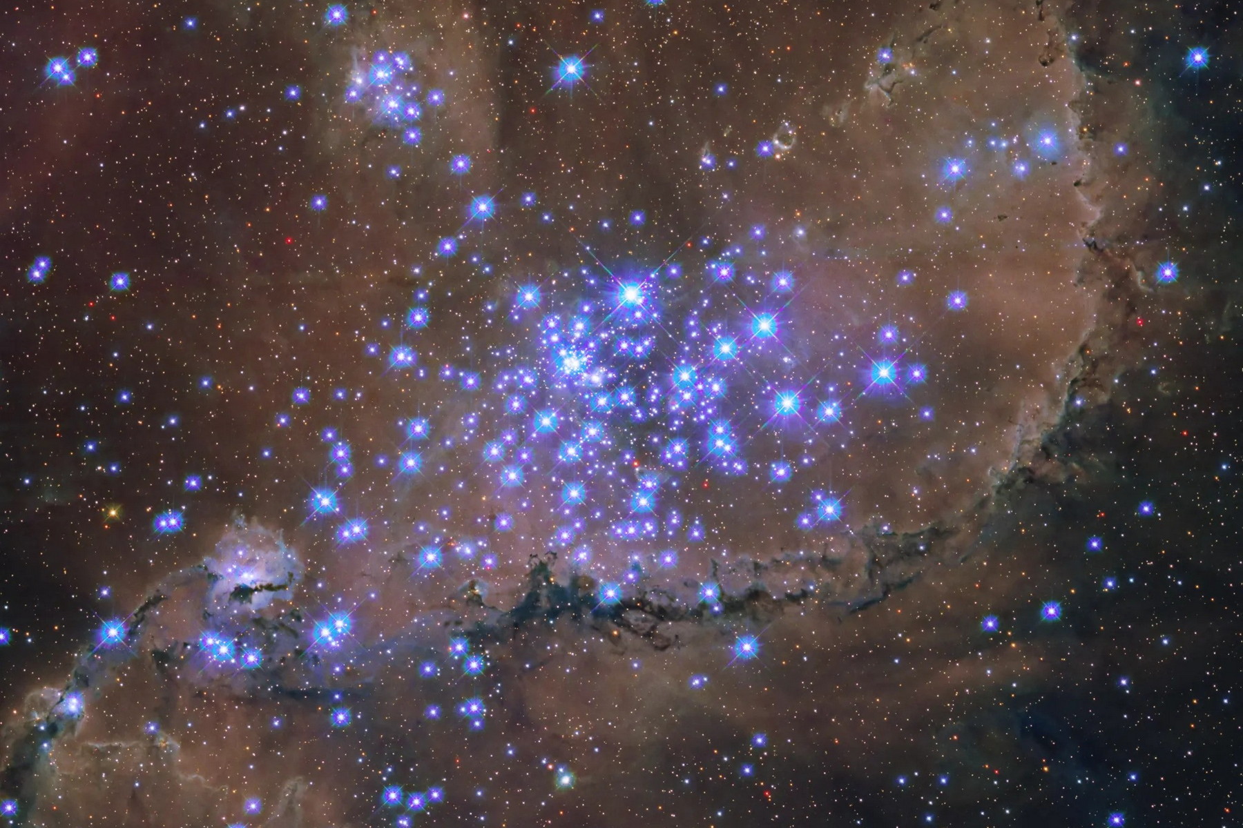 Pohled na hvězdokupu NGC 346 v ultrafialovém spektru. Hubbleův dalekohled kombinuje velké rozlišení s pozicí nad pozemskou atmosférou, která chrání zemský povrch před ultrafialovým zářením. V dnešní době je jediným dalekohledem, který může pořizovat kvalitní ultrafialové snímky vzdálených kosmických objektů. (foto: NASA, ESA, A. James, C. Murray, CC BY-SA 4.0)