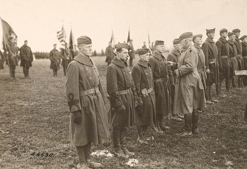 Generál Hanson Ely připíná Kříž za vynikající službu americkým vojákům, Lucembursko, prosinec 1918. (foto: Wikimedia Commons, NARA, PDM 1.0)