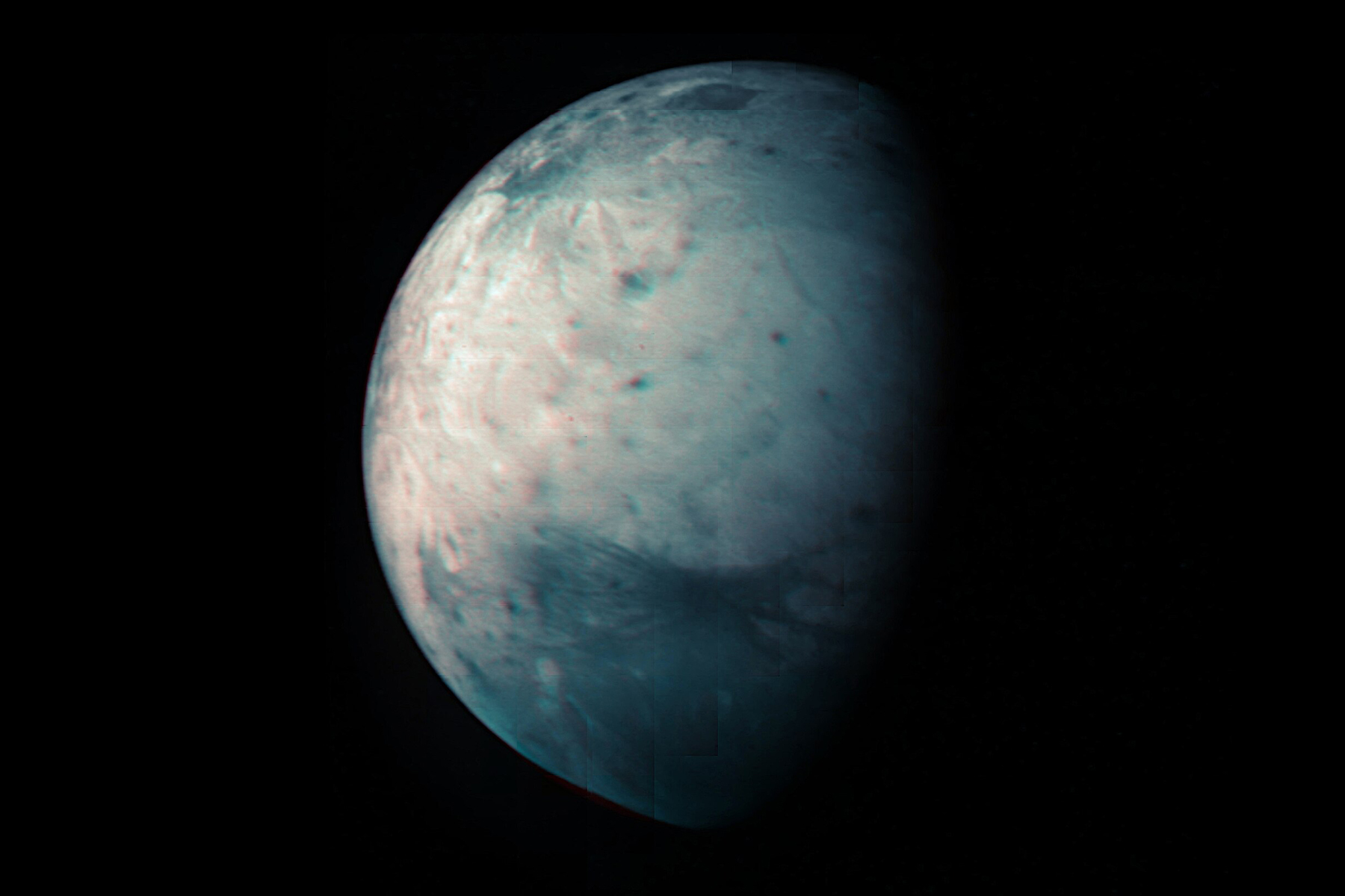 Ganymed je mezi měsíci Sluneční soustavy opravdový obr. Jeho střední poloměr je 1,5× větší než poloměr Měsíce a je dokonce větší než Merkur. Podobně jako pozemský Měsíc i Ganymed obíhá svou planetu ve vázané rotaci a ukazuje jí tak stále stejnou stranu. (foto: Wikimedia Commons, NASA/JPL-Caltech, PDM 1.0)