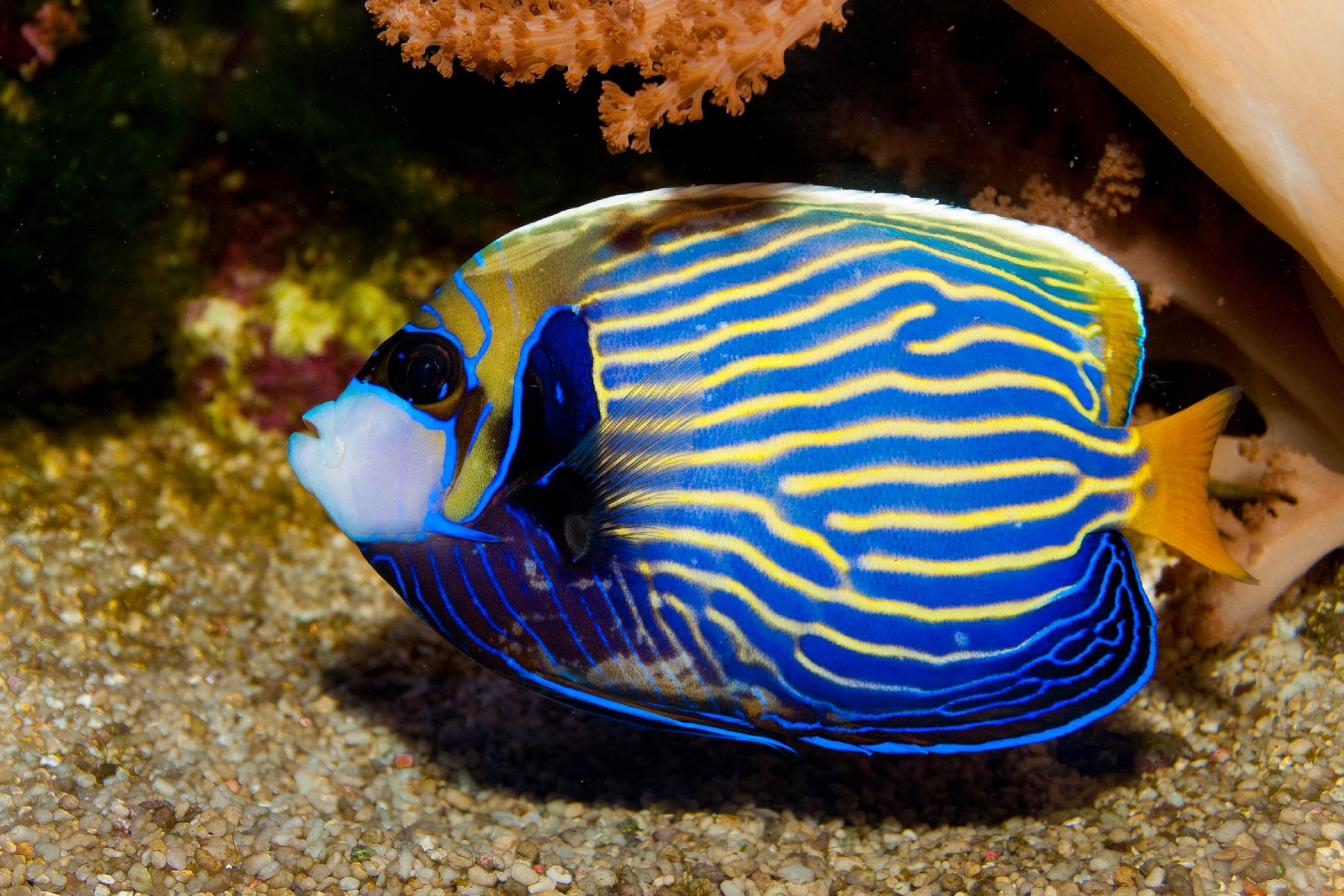 Pomec císařský (Pomacanthus imperator), jedna z korálových rybek, která nesnese přítomnost jedince stejného druhu. Důsledkem vyzývavého zbarvení jsou nemilosrdné boje na život a na smrt. (foto: Shutterstock)