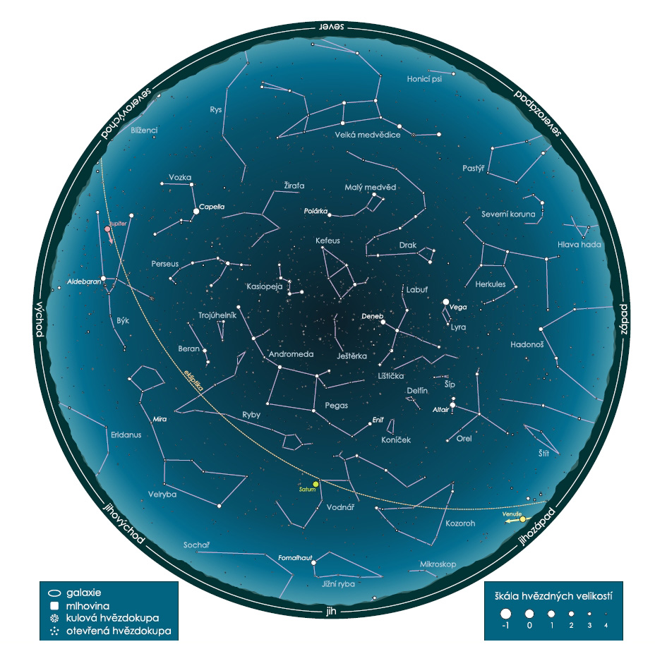 Obdélníková mapa uvádí přibližné polohy významných těles Sluneční soustavy na listopadové obloze. U Měsíce jsou zvýrazněny pozice (včetně přesného data), kdy nastává první čtvrt, úplněk, poslední čtvrt a nov. (zdroj: Hvězdárna a planetárium Brno, Jan Píšala - se souhlasem k publikování)
