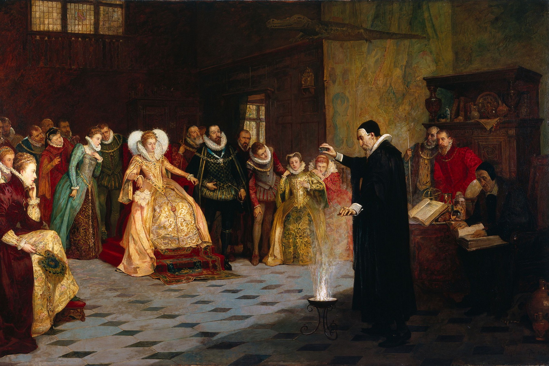 John Dee předvádí své experimenty anglické královně Alžbětě I. Právě kvůli vazbám na anglickou panovnici byl podezříván a nakonec i obviněn ze špionáže pro anglickou korunu. (ilustrace: Wikimedia Commons/Wellcome Collection, Henry Gillard Glindoni, CC BY 4.0)