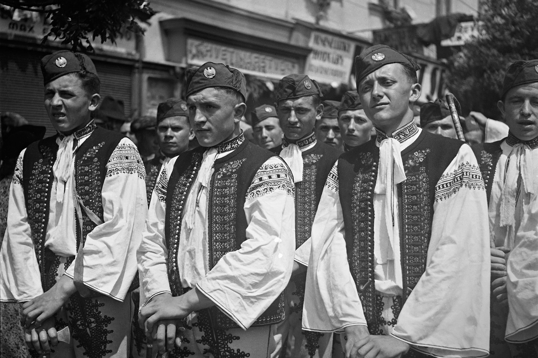 Přehlídka Hlinkovy mládeže v Trenčíně. Plán na připojení východní Moravy ke Slovensku se mimo jiné zdůvodňoval také podobnými folklorními tradicemi. (foto: Wikimedia Commons, PDM 1.0)
