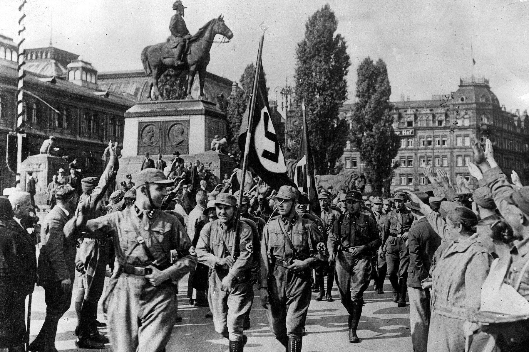 Horst Wessel v čele svých mužů při průvodu ulicemi Norimberku roku 1929. (foto: Wikimedia Commons, Narodowe Archiwum Cyfrowe, CC BY-SA 4.0)