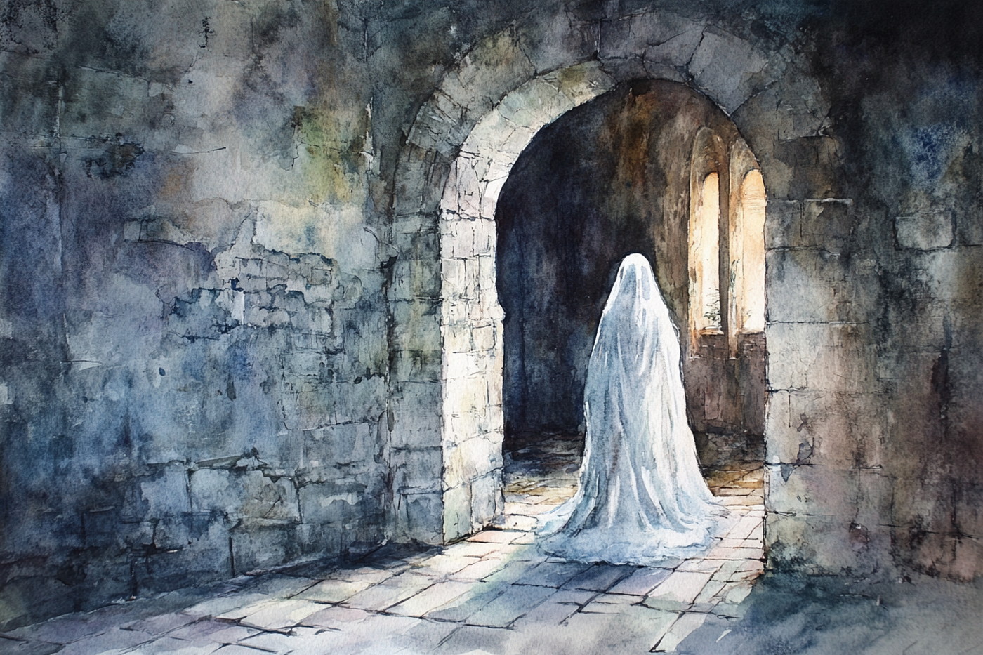 Bílá paní se podle různých pověstí zjevuje v celé řadě lokalit nejen v Evropě. Legenda o bílé paní se traduje také v Brazílii, v Kanadě nebo třeba v Thajsku. (ilustrace: Midjourney AI, PDM 1.0)