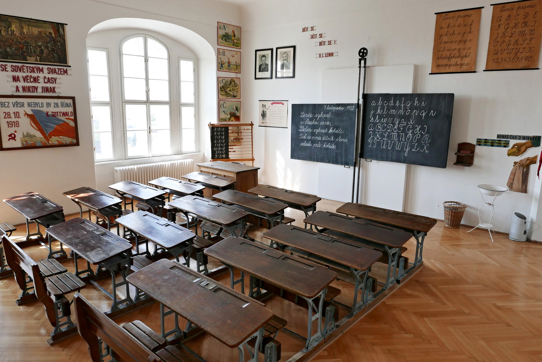 Školní třída padesátých let minulého století v expozici Muzea Komenského v Přerově. Na zdi nechybějí fotografie Gottwalda a Stalina. (foto: Muzeum Komenského v Přerově, Dáša Vláčilová, CC BY 4.0)