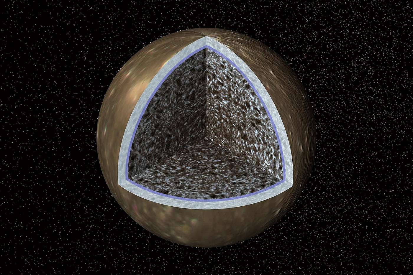 Ilustrace vnitřní struktury měsíce Callisto, vytvořená podle poznatků sondy Galileo z devadesátých let. (ilustrace: Wikimedia Commons, NASA/JPL-Caltech, CC BY-SA 4.0)