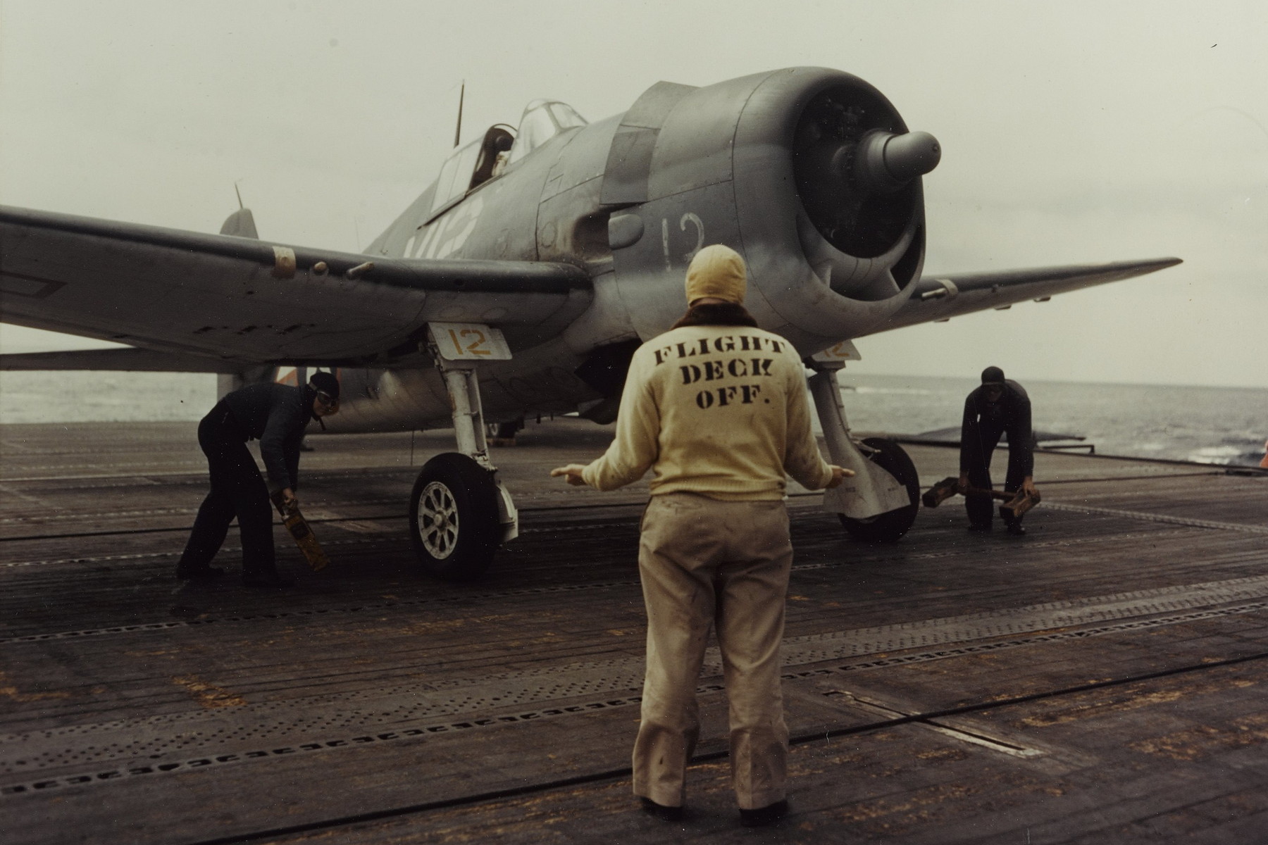 Příprava stíhačky Grumman F6F Hellcat ke cvičnému startu z paluby letadlové lodě, polovina roku 1943. (foto: Wikimedia Commons, tormentor4555, PDM 1.0)