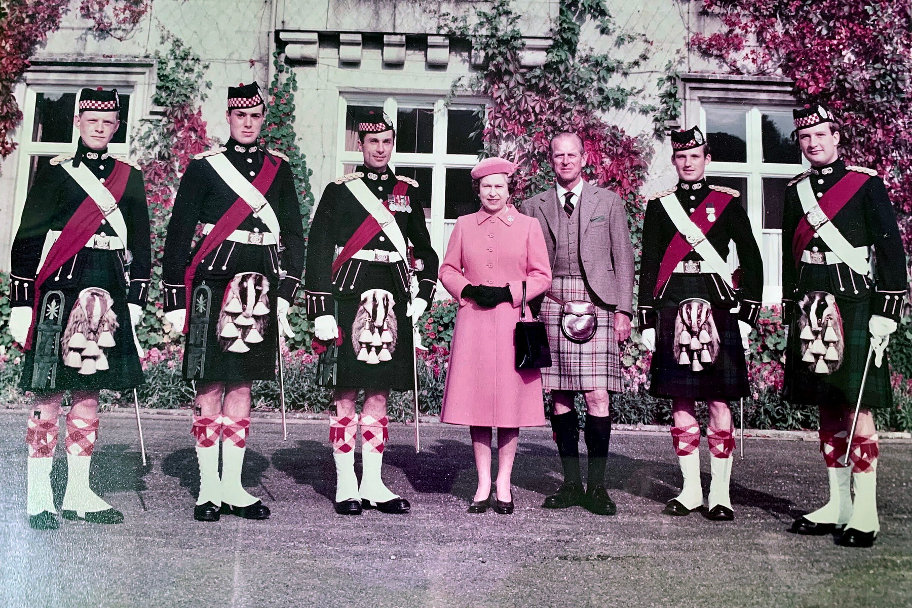 Důstojníci Argyll and Sutherland Highlanders s královnou Alžbětou II. a princem Philipem na zámku Balmoral v roce 1985. (foto: Wikimedia Commons, Editor9193, CC BY-SA 4.0)