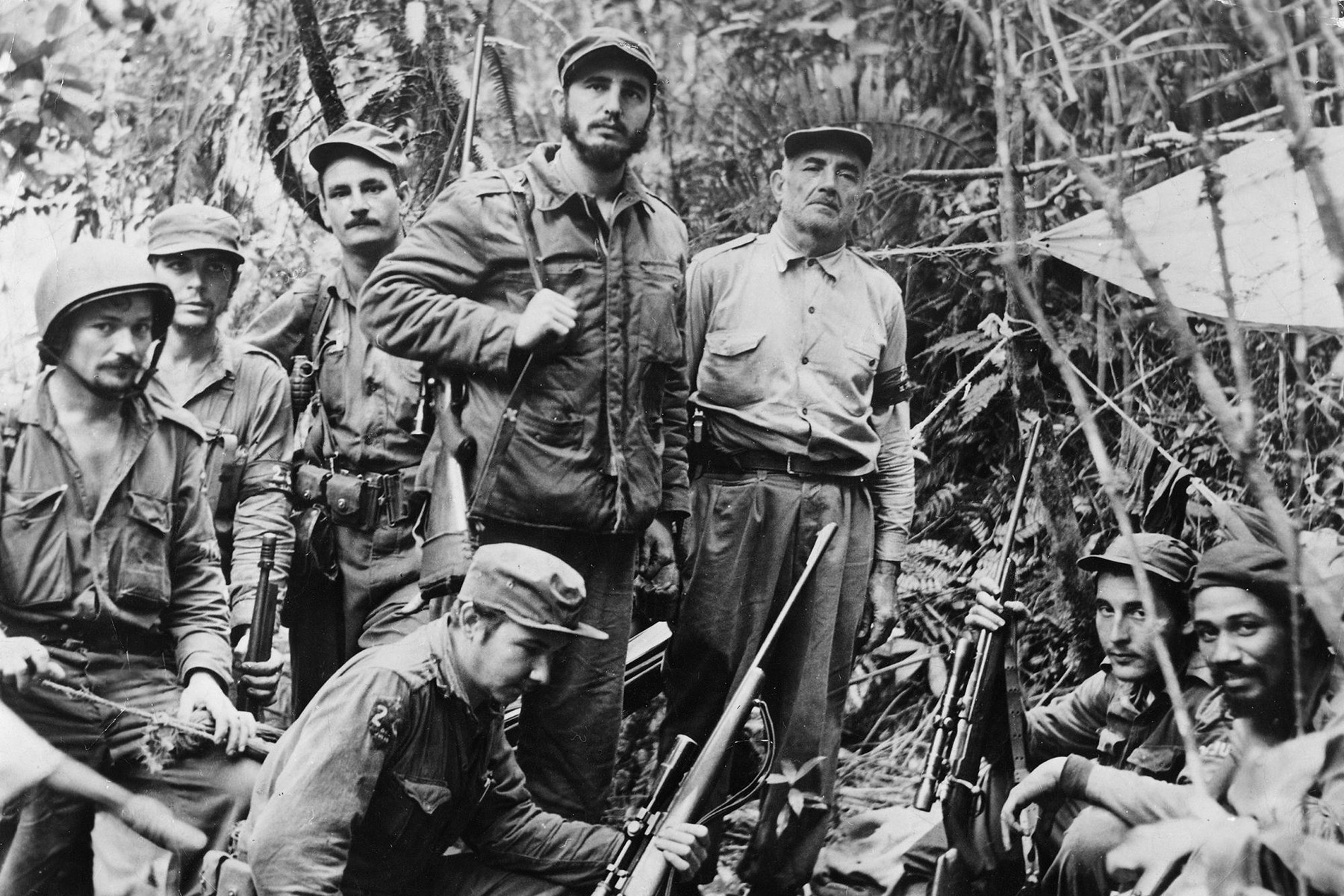 Fidel Castro se svým velitelským štábem v tajném úkrytu v džungli v roce 1958. Druhý zleva stojí Ernesto Che Guevara, vpředu v pokleku Raúl Castro. (foto: Wikimedia Commons, PDM 1.0)