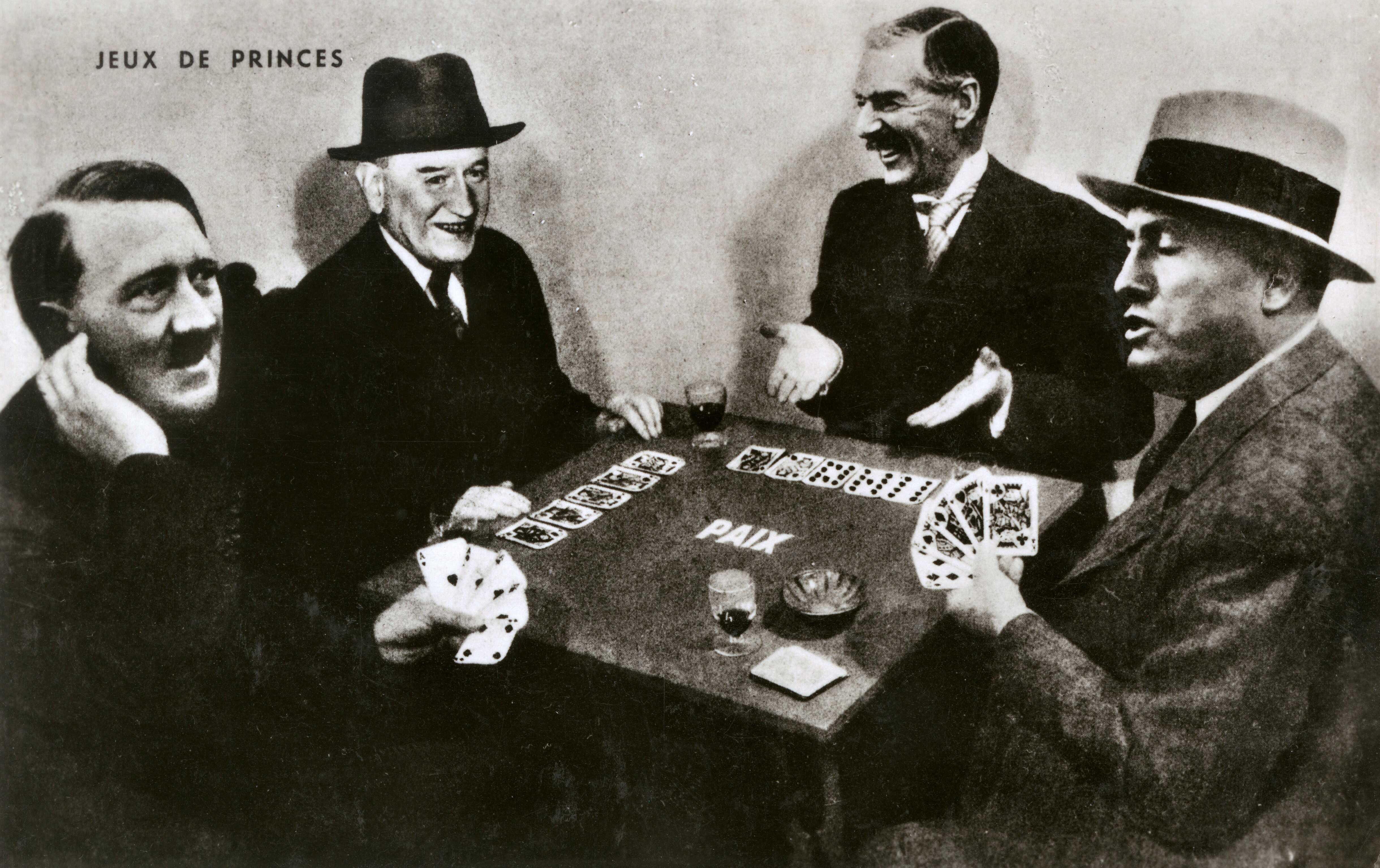 Karikaturisticky znázorněná mnichovská konference, která Německu mírovou cestou získala Sudety. Představitelé evropských mocností „hrají o mír“, povšimněte si es v Hitlerově ruce. (foto: Profimedia)