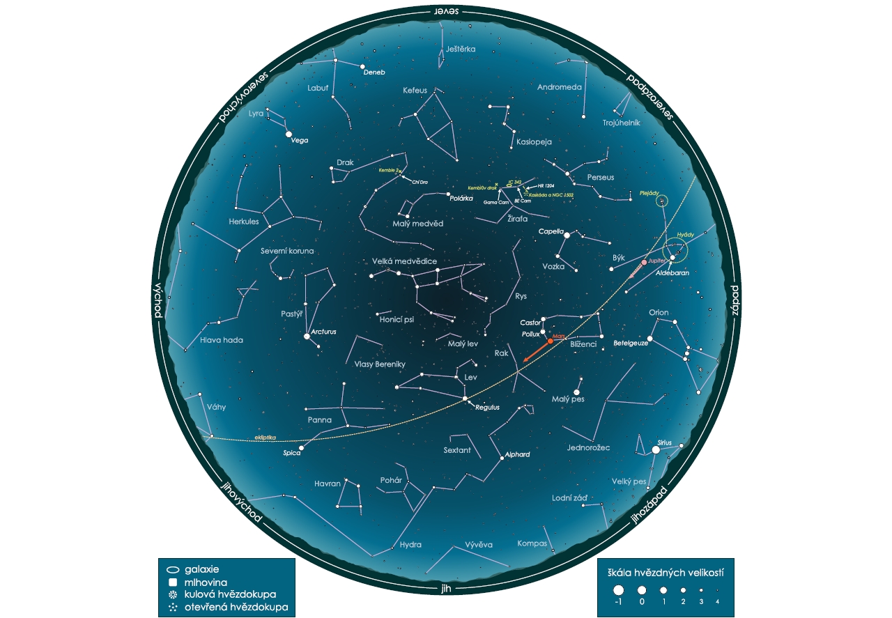 • Kruhová mapa zobrazuje podobu nočního nebe 15. dubna 2025 ve 22:00 středoevropského letního času (SELČ). Na počátku měsíce platí pro 23:00 SELČ, na jeho konci pro 21:00 SELČ. (zdroj: Jan Píšala - se souhlasem k publikování)