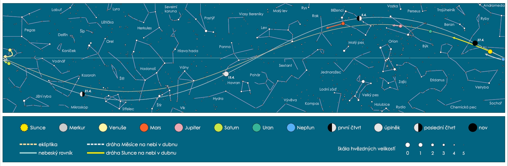 • Obdélníková mapa uvádí přibližné polohy významných těles Sluneční soustavy na dubnové obloze. U Měsíce jsou zvýrazněny pozice (včetně přesného data), kdy nastává první čtvrt, úplněk, poslední čtvrt a nov. (zdroj: Jan Píšala - se souhlasem k publikování)