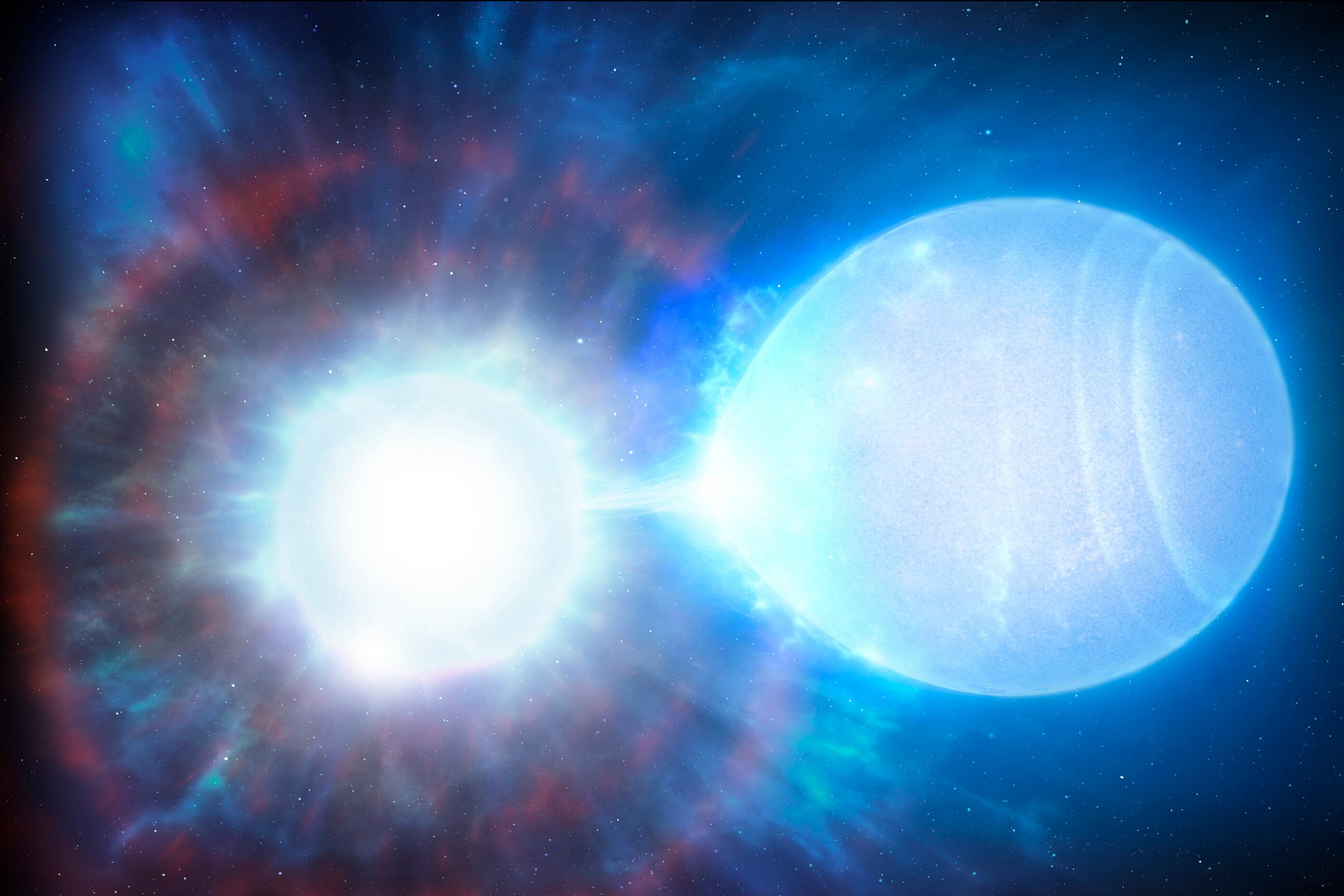 Ve vzdálenosti asi 150 světelných let se nachází těsná dvojhvězda bílých trpaslíků, která exploduje několika supernovami. (ilustrace: University of Warwick, Mark Garlick, CC BY-SA 4.0)