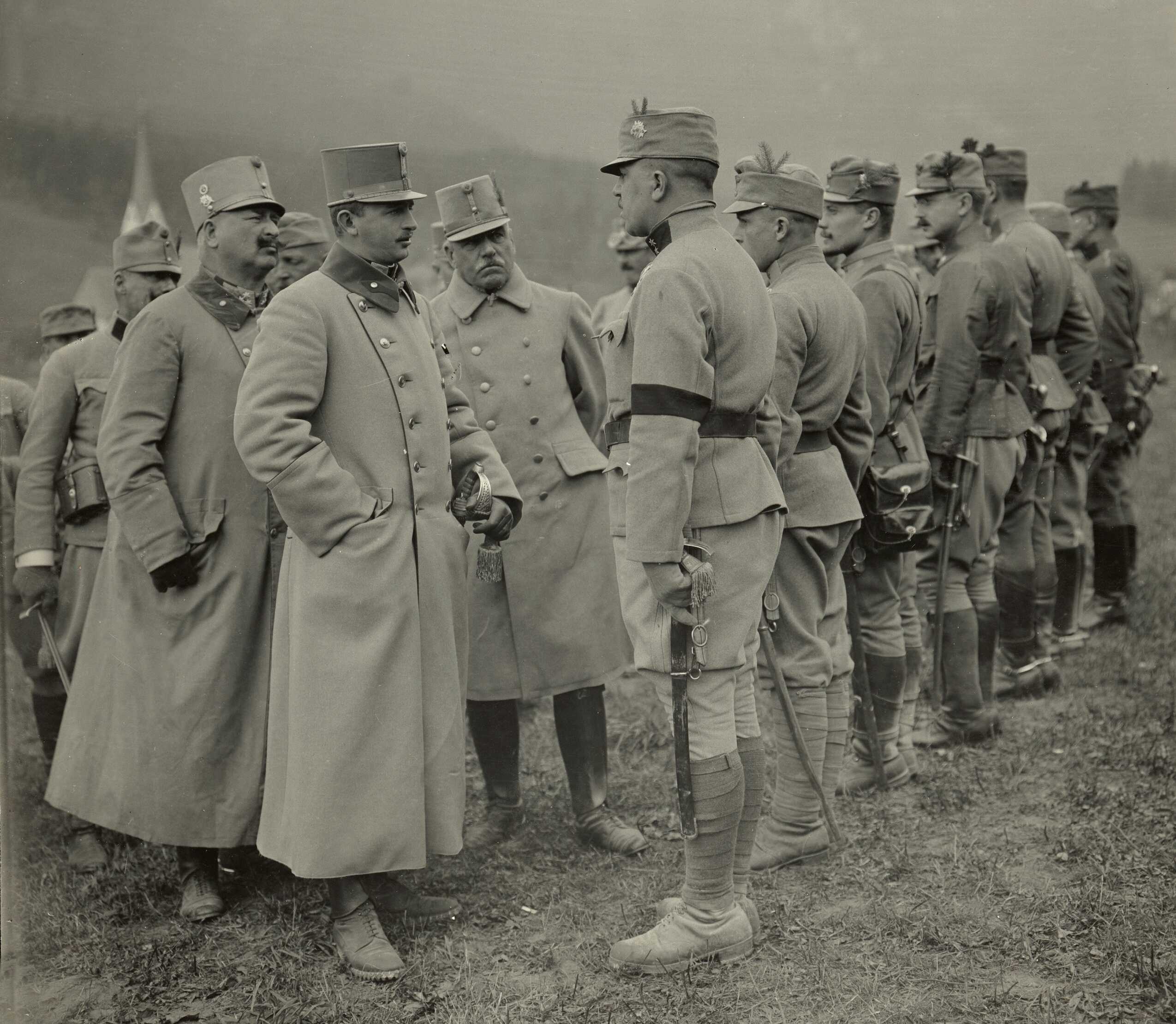 Inspekce císaře Karla I. na frontě. Po jeho nástupu měnili vojáci kokardy s iniciály panovníka. (foto: Profimedia)