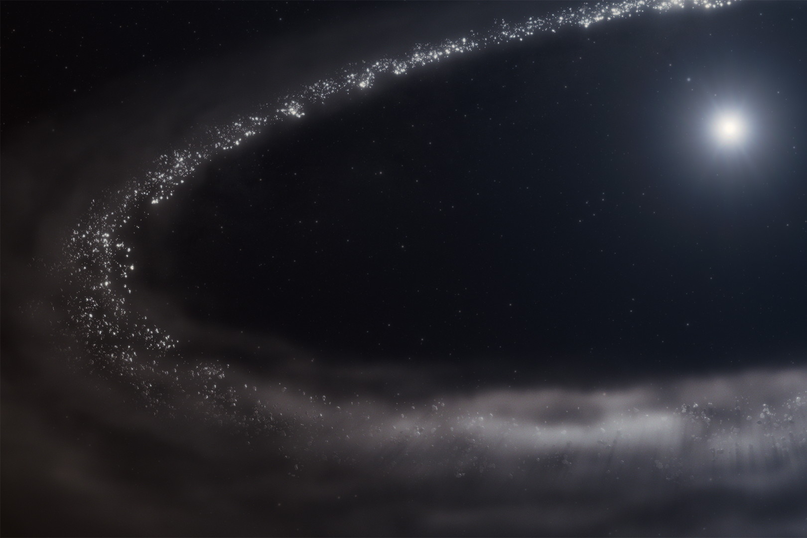 Pomocí vesmírného teleskopu NASA Jamese Webba vědci poprvé potvrdili přítomnost krystalického vodního ledu v prachovém disku, který obíhá kolem hvězdy podobné Slunci. (ilustrace: NASA, ESA, CSA, STScI, Ralf Crawford, CC BY-SA 4.0)