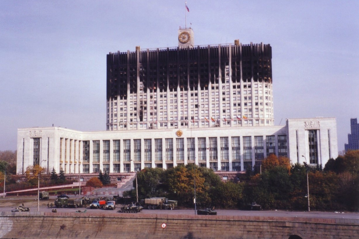 Bílý dům ráno 4. října s ohořelou vrchní částí. Před budovou se nachází vojenská technika (Foto: Wikimedia)