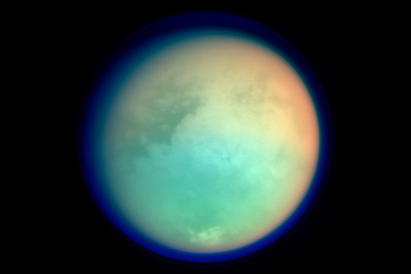 Snímek Titanu v nepravých barvách, pořízený sondou Cassini 26. října 2004, na kterém je zřetelně viditelná jeho atmosféra. (foto: NASA/JPL/Space Science Institute, CC BY-SA 4.0)