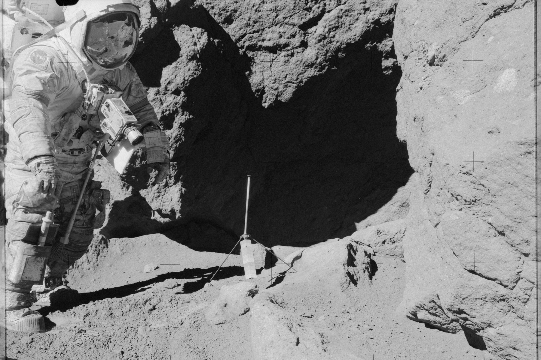 Vulkanické sklo na Měsíci objevila posádka mise Apollo 17 – Eugene Cernan (na snímku) a Harrison Schmitt. (foto: Wikimedia Commons, NASA, Harrison Schmitt, CC BY-SA 4.0)