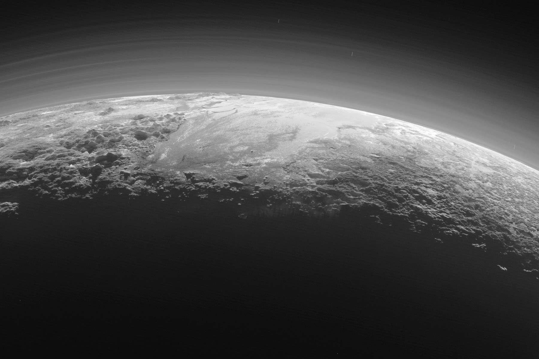 Snímek Pluta jak jej v roce 2015 zachytila sonda New Horizons. Opar, který obklopuje povrch této trpasličí planety, hraje podle vědců klíčovou roli v utváření její atmosféry a klimatu. (foto: Wikimedia Commons, NASA/JHUAPL/SwRI, CC BY-SA 4.0)