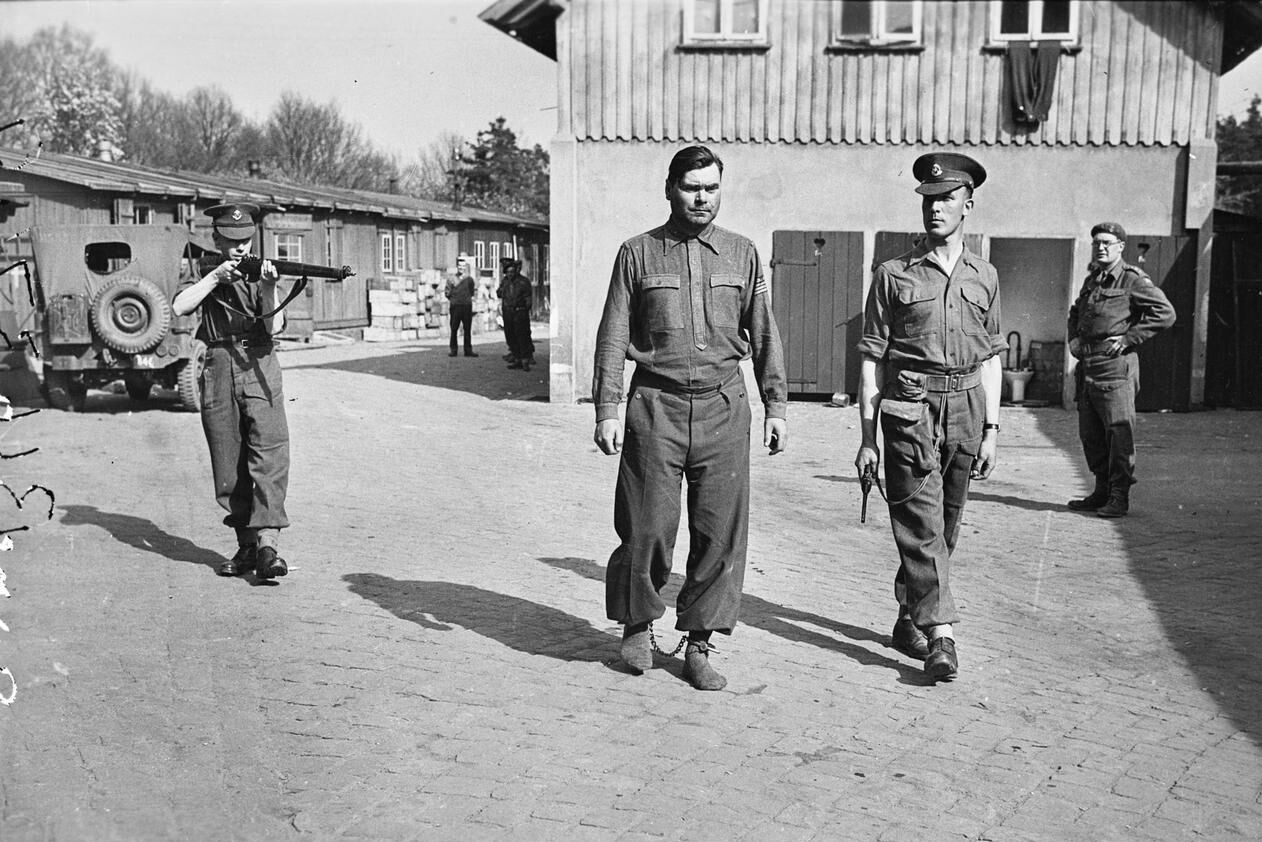 Britský voják vede zatčeného Kramera po dvoře koncentračního tábora Bergen-Belsen. (foto: Wikimedia Commons, Imperial War Museums, IWM Non-Commercial Licence)