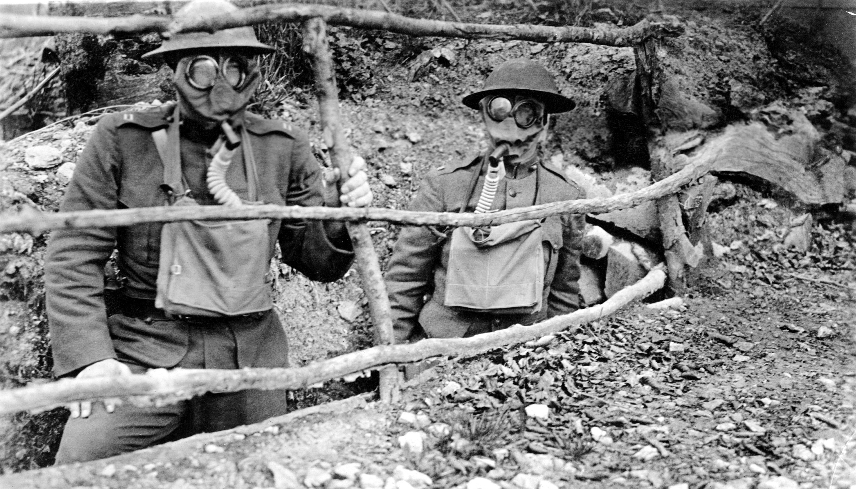 Američtí pěšáci v zákopech na západní frontě. Buď očekávají plynový útok, nebo pózují fotografovi. (foto: Shutterstock)
